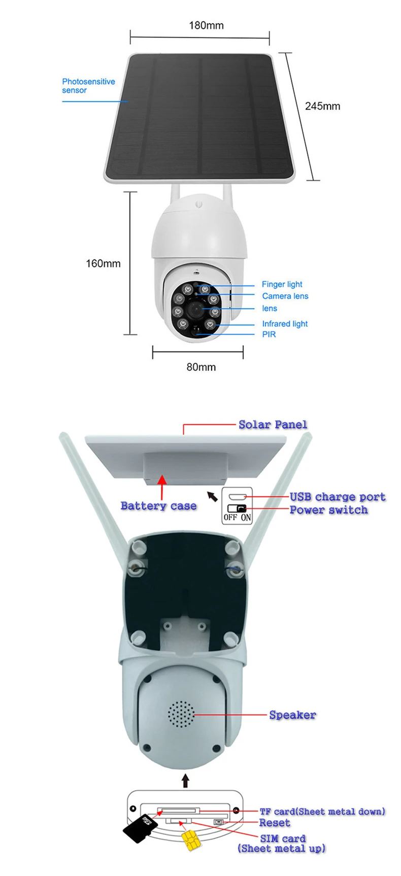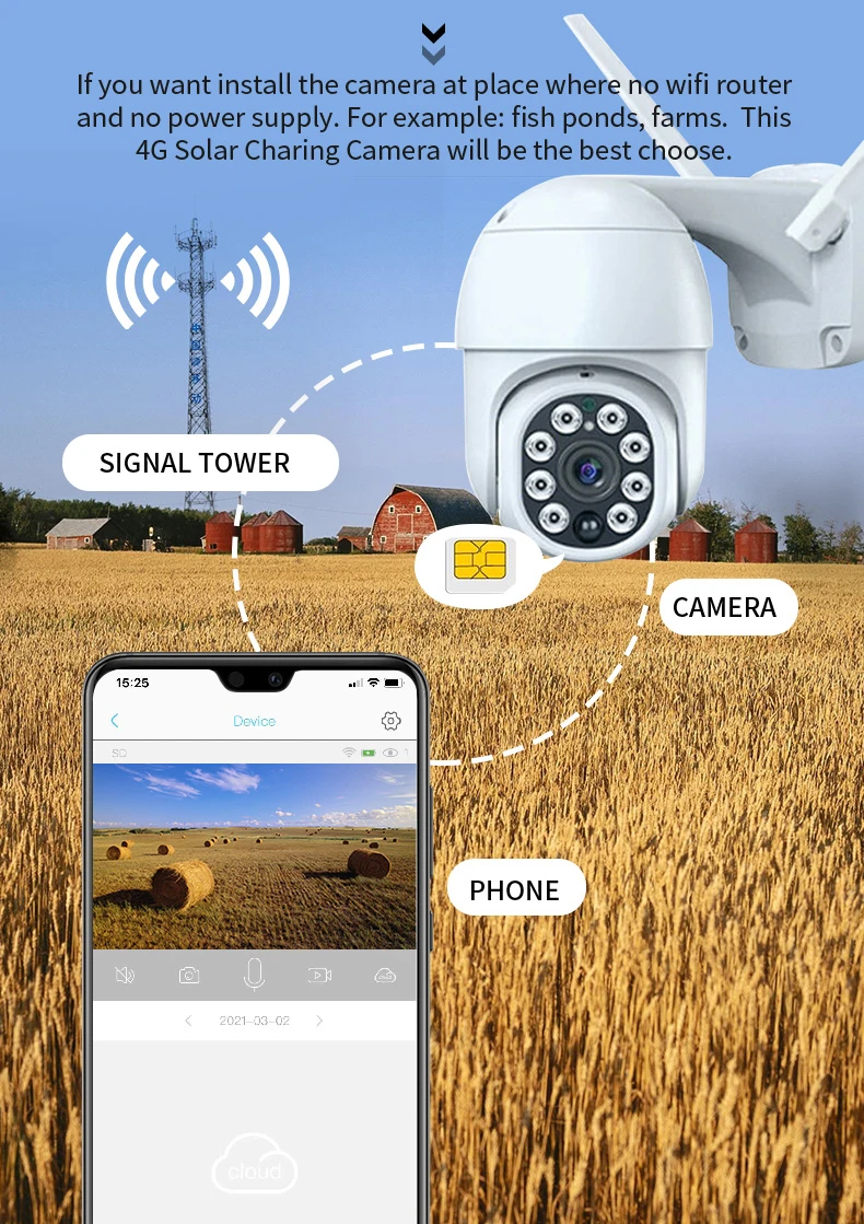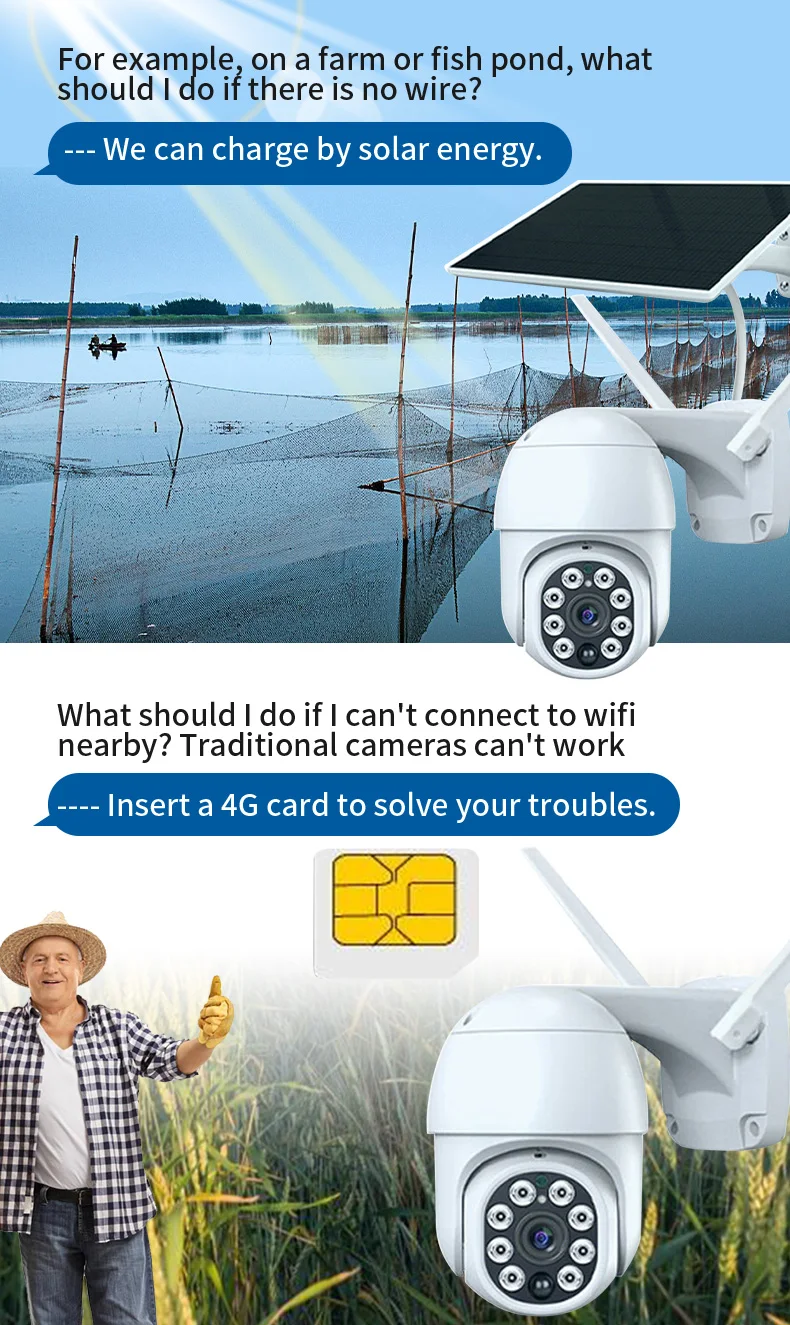 If you want install the camera at place where no wifi router and no power supply,Forexample: fish ponds, farms. This 4G Solar charing Camera will be the best choose.