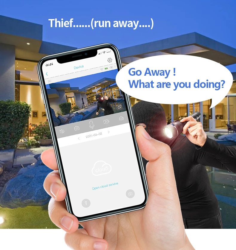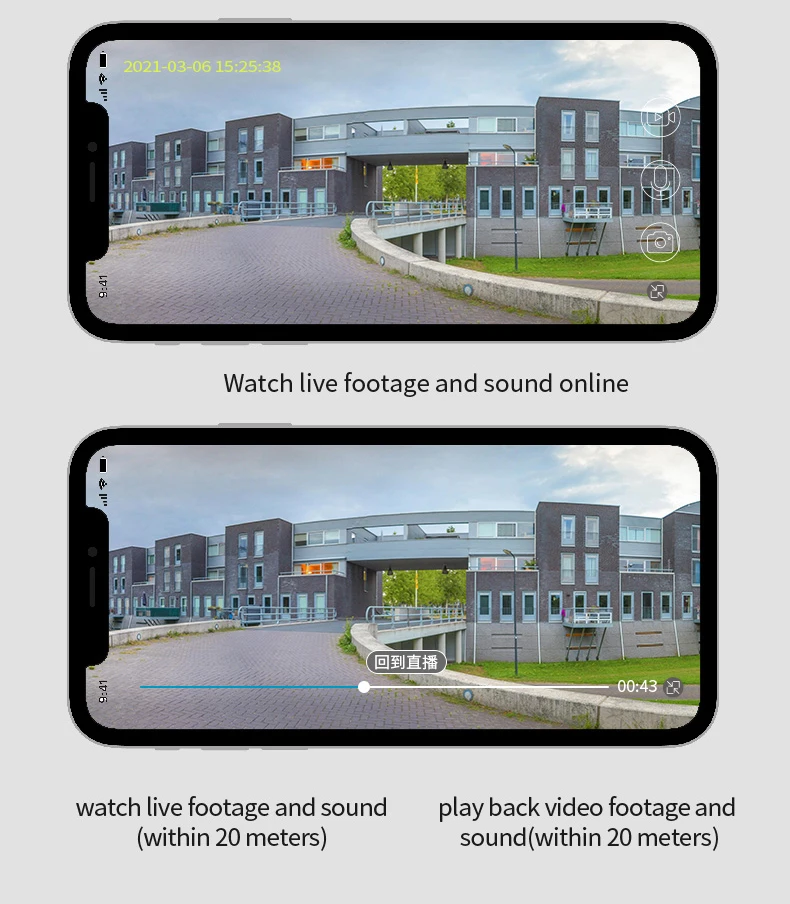 after the camera is connected to the network ,you can open the monitoring app through your mobile phone to watch the real-time picture , online playback with video records stored in the memory card