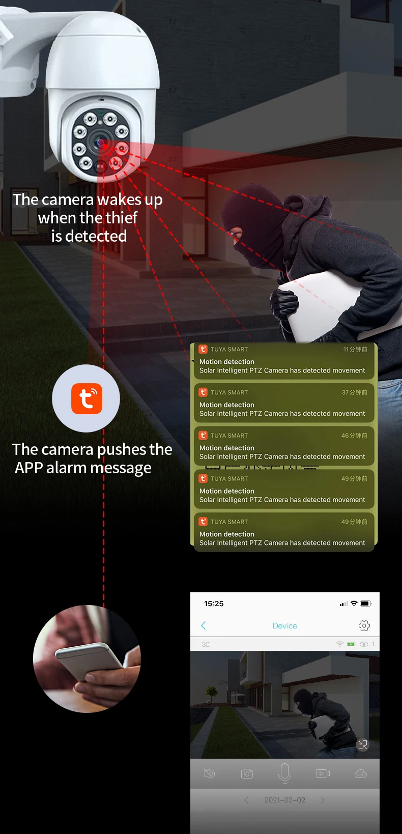 The solar surveillance camera works in the sun, so it will naturally encounter rainy weather waterproof grade lP66 can work contimuously in rain